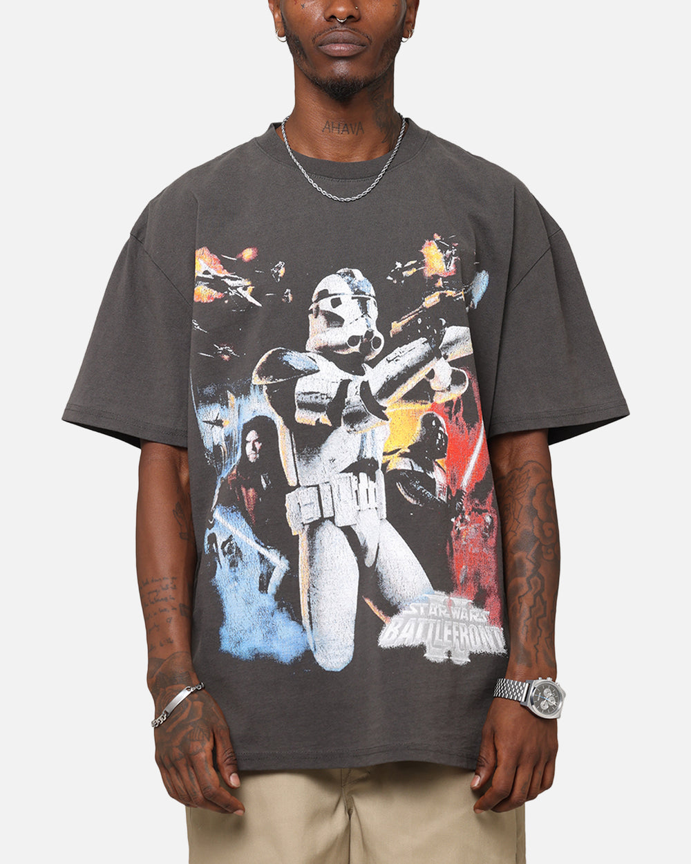 Calling all Star Wars fans! Immerse yourself in the epic world of Star Wars collaboration with the Star Wars Battlefront Heavy T-Shirt. This tee is a must-have for any true fans featuring printed graphics that is sure to give you a massive nostalgia hit. The tee has been given a vintage wash for that classic lived-in look, and twin-needle stitching provides extra reinforcement. Don't miss out on this amazing opportunity to own a piece of Star Wars history. Secure your tee today at Culture Kings.