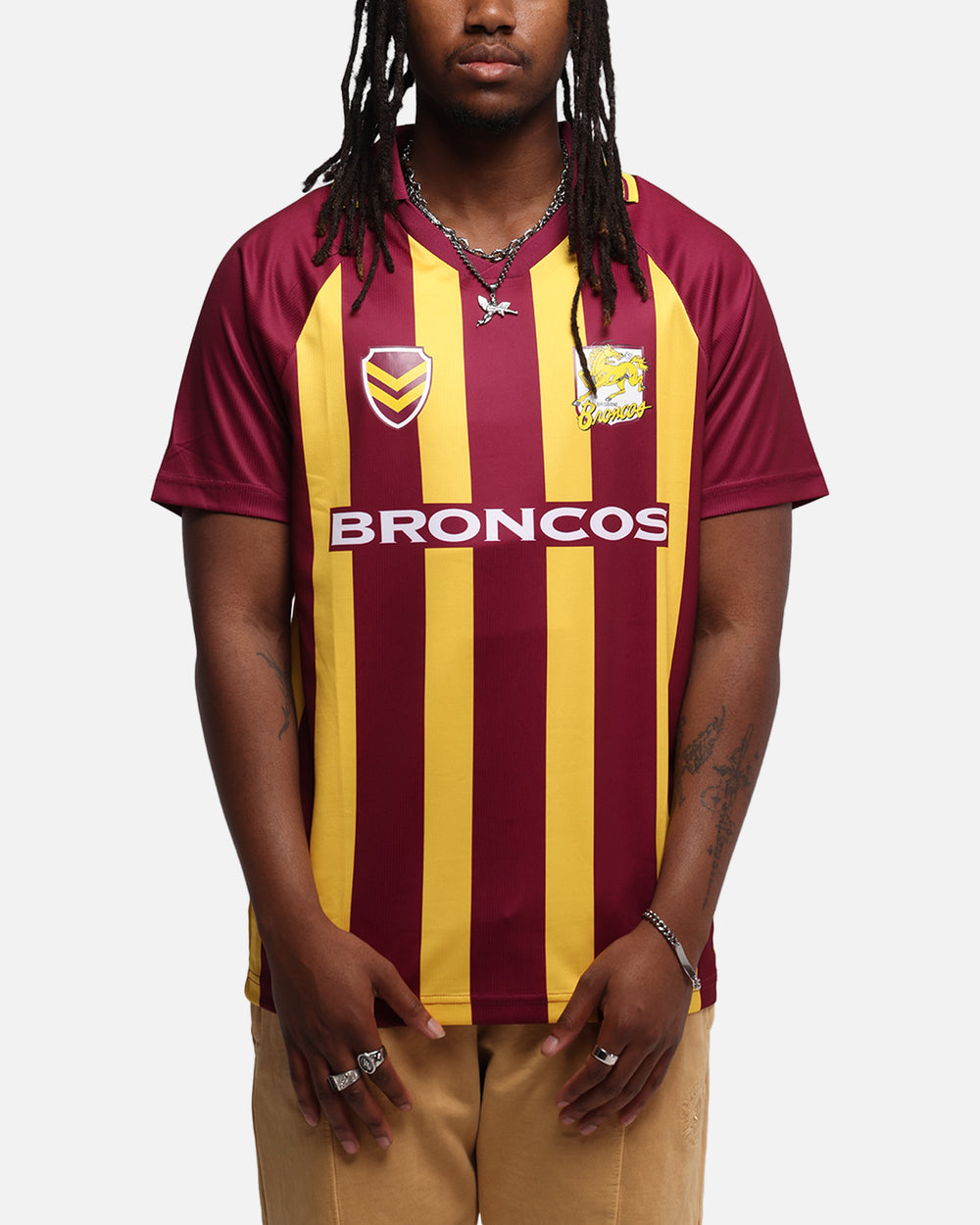 Step up your game day ‘fit with the Bleacher Athletic Brisbane Broncos NRL 1908 Collared T-Shirt – where vintage rugby heritage meets street-level energy. This isn’t just a tee – it’s a certified throwback flex. Featuring a mix of printed and embroidered graphics with an all-over pinstripe design and contrast v-neck collar for a classic retro feel. Cop yours today at Culture Kings.