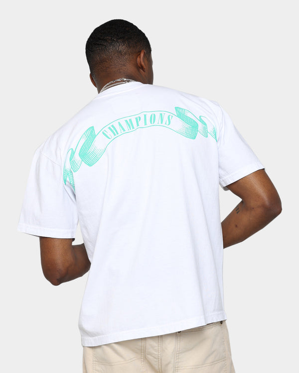 Cop a staple white tee that's made for champions. Featuring printed graphics, dropped shoulders for a classic streetwear look and a ribbed crewneck on a premium cotton construction for a comfortable fit. Cop it today.