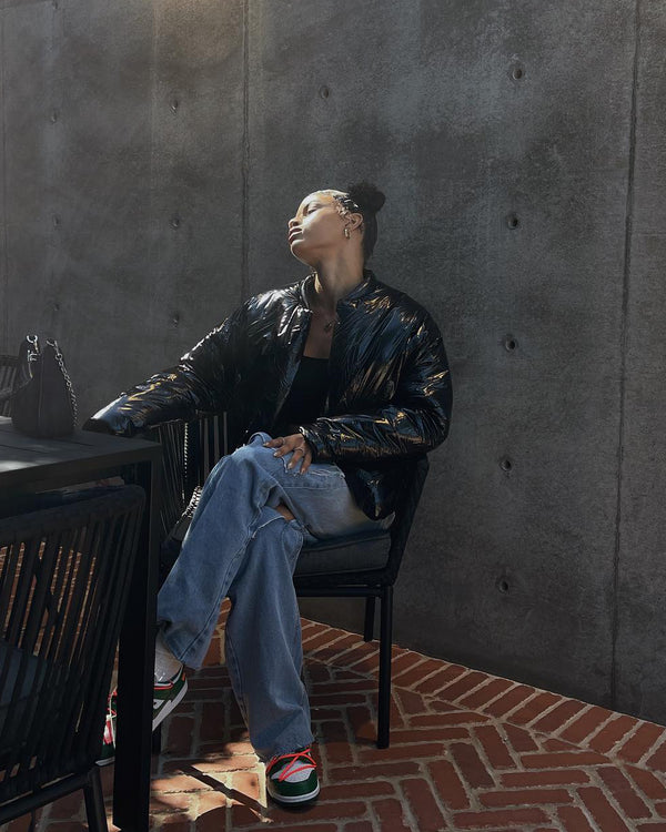Due to styling Xanetia is wearing a men’s size M for an oversized fit.