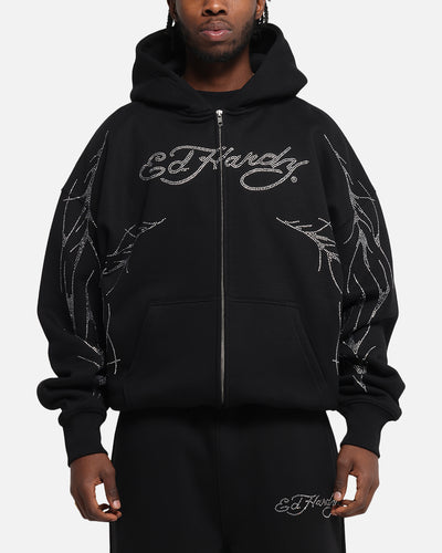 Embrace your unique vibe with the Ed Hardy Cyber Rhinestone Zip-Up Hoodie—where edgy design meets everyday comfort. This striking hoodie features bold rhinestone graphics across the front inspired by Ed Hardy’s iconic tattoo art. Crafted from a cozy brushed fleece interior that is perfect for that extra warmth. The oversized boxy fit and ribbed trims ensure you stay comfortable while making a statement, no matter the occasion. Cop yours today at Culture Kings.