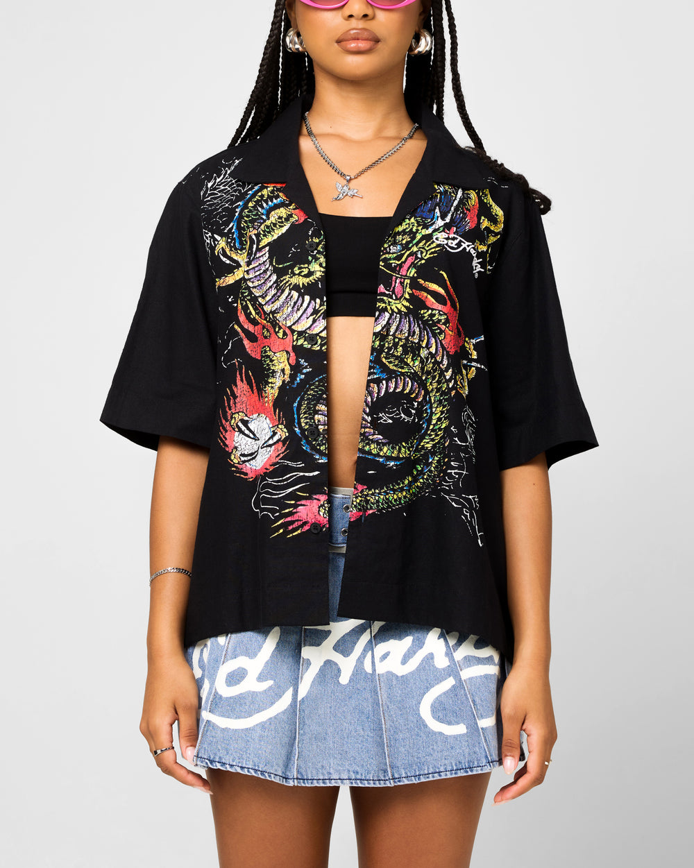 Embrace your bold side with the Ed Hardy Dragon Button-Up Shirt, where classic style meets edgy artistry. This shirt is perfect for those who want to stand out and express their unique personality. This shirt features striking printed graphics that pays homage to Ed Hardy's iconic tattoo-inspired aesthetic. With its tailored fit and button-up design, it’s versatile enough for both casual outings and nights out. Cop yours today at Culture Kings.