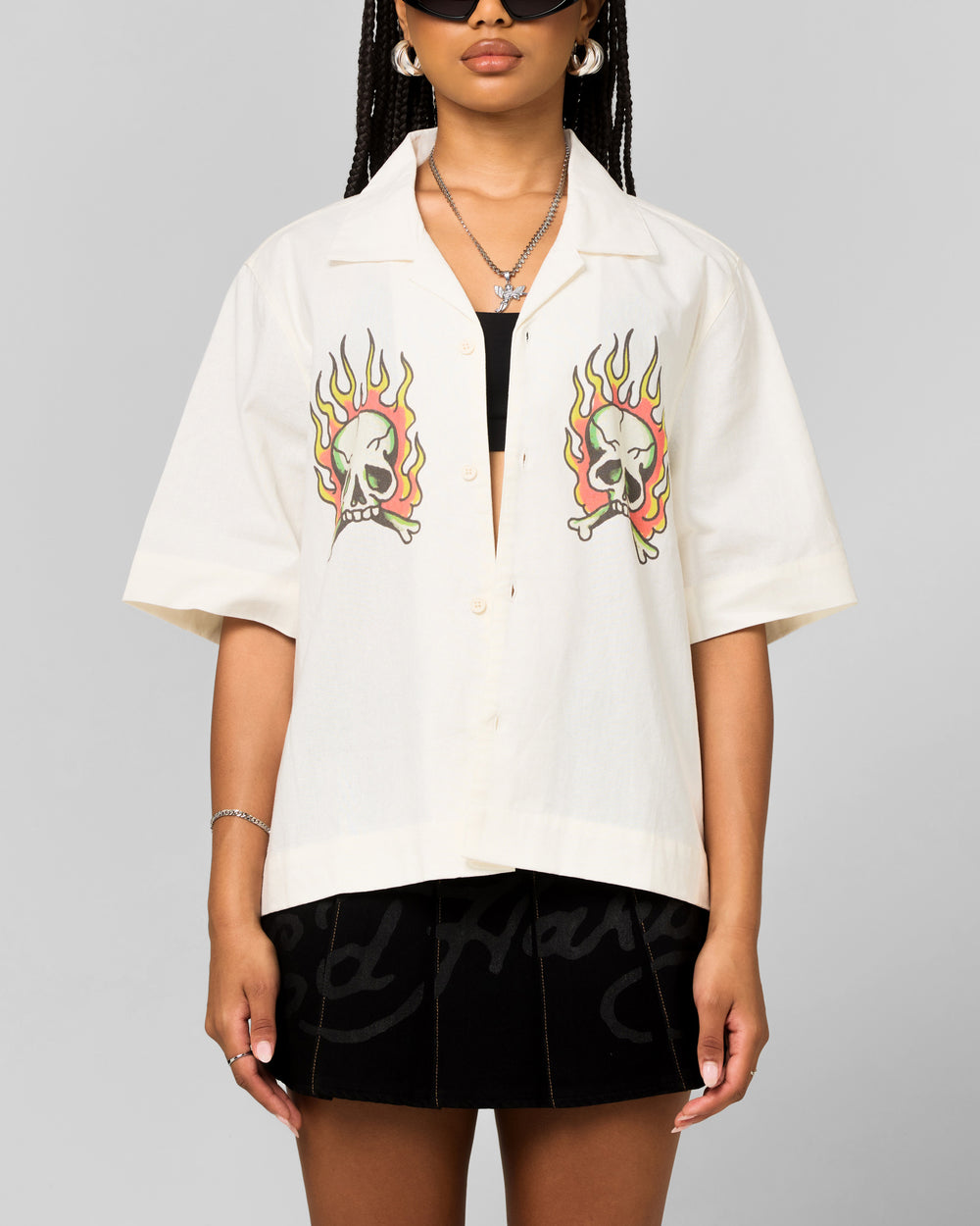 Embrace your bold side with the Ed Hardy Flaming Skull Button Up Shirt, where classic style meets edgy artistry. This shirt is perfect for those who want to stand out and express their unique personality. This shirt features striking printed graphics that pays homage to Ed Hardy's iconic tattoo-inspired aesthetic. With its tailored fit and button-up design, it’s versatile enough for both casual outings and nights out. Cop yours today at Culture Kings.