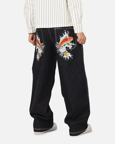 Step up your style game with the Ed Hardy Koi Jeans —where classic craftsmanship meets bold artistic expression. Designed to celebrate individuality, these jeans feature unique Ed Hardy embroidered graphics and details that make a statement with every wear and the baggy wide-leg fit that blends the effortless streetwear style. Finished with premium denim construction and contrast stitching ensures you stand out from the rest. This is a must-have in any wardrobe.