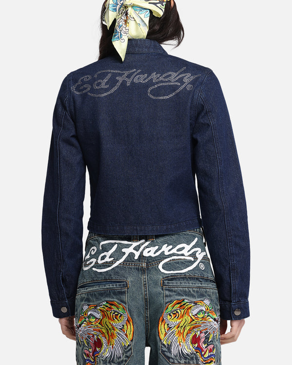 Transform your wardrobe with the Ed Hardy Women's Cropped Denim Biker Jacket —where classic style meets bold expression. This iconic piece features striking Ed Hardy rhinestone details towards the back that celebrate the art of tattoo culture, seamlessly blended with the dropped shoulders for a laid-back vibe of streetwear culture with a timeless denim construction and slightly cropped fit, making this piece a must-have to stand out from the rest. Cop yours today at Culture Kings.