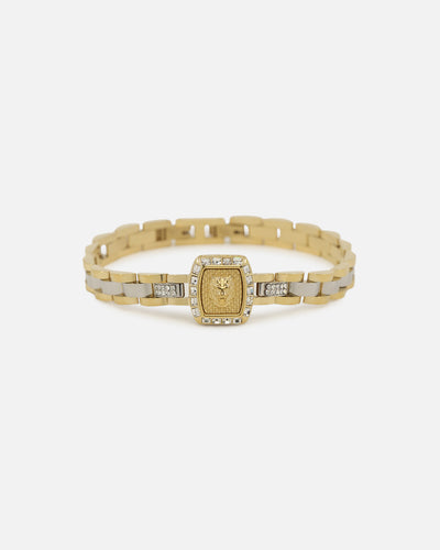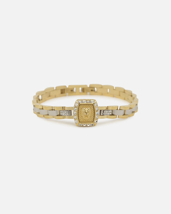 Make a roaring statement with this gold-tone bracelet. Featuring a lion coin motif with bold crystal details and a perfectly polished 16mm silver and gold chain bracelet with stainless steel base. Cop yours today at Culture Kings.