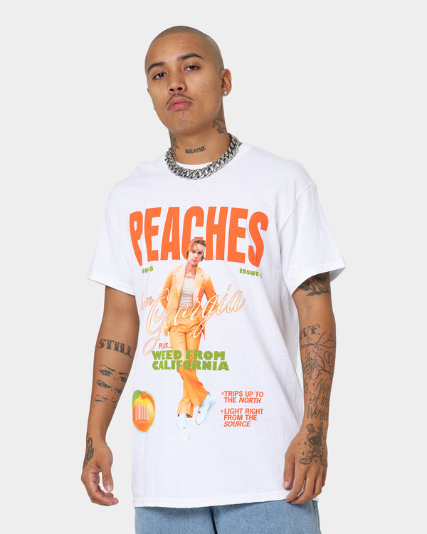 Justin Bieber has dropped new must-have 'fits, and every fit starts with a premium tee. Featuring an iconic graphic of Justin himself, the Peaches T-Shirt is Justin at his best. With a throwback band-tee design for that vintage look and feel, quality cotton and a luxe construction. Become the peach of your own world with this Bieber tee!