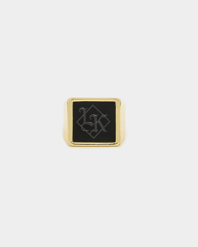 Add The Throne Ring to your collection. Made with 18k Plated Gold, the Last Kings Throne Ring features a bold debossed resin LK seal logo, set in a classic signet ring silhouette.