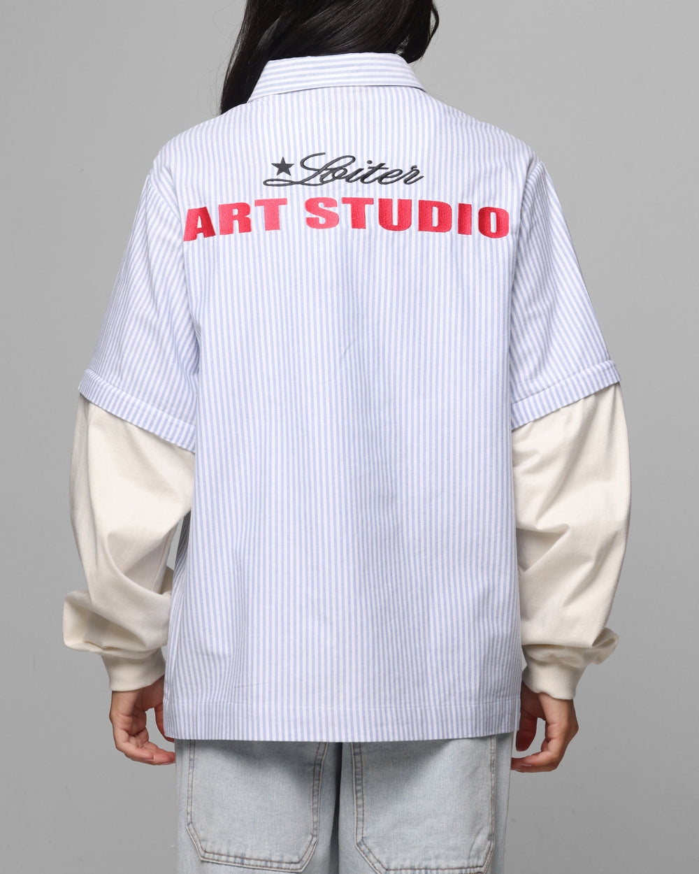 Make your 'fits pop with the Art Studio Work Shirt by Loiter. With embroidered graphics with a button-up for that classic vibe, with contrast white sleeves and all over pinstripes for a standout look. Finished off with an ultra flattering oversized fit and dropped shoulders. Be sure to cop yours today at Culture Kings.
