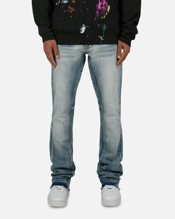 Elevate your fits' with the B484 Flare Denim Jeans by MNML. These are designed with a new B fit, which is slim through the thigh and features a slight flare at the leg opening and is constructed from medium washed blue denim, panelling at the inseam and outseam from denim for a slight flare, distressing details at the back of the leg openings, and finished with a deconstructed hem. Cop yours today at Culture Kings.