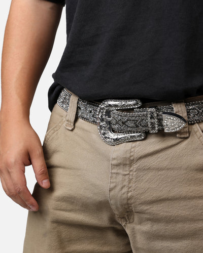 The Chevron Caviar Belt is made from black leather and features intricate Western design motifs on the metal buckle, tip and loop, with crystals applied throughout. Cop yours today at Culture Kings.
