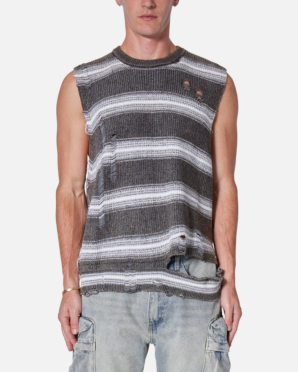 Elevate your fits' with the Destroyed Pullover Shirt by MNML. This shirt features a flat hem line, raw edges at the shoulder for a sleeveless body, and distressing details throughout, and is finished in a heavy wash on a striped cotton ribbed fabric. Cop yours today at Culture Kings.