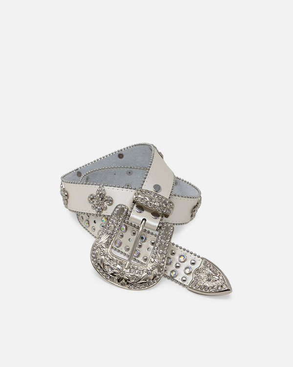 The Fleur Studded Rhinestone Belt is made from black leather and features intricate Western design motifs on the metal buckle, tip and loop, with rhinestone-embellished fleurs-de-lis and pearlescent rhinestones throughout. Cop yours today at Culture Kings.