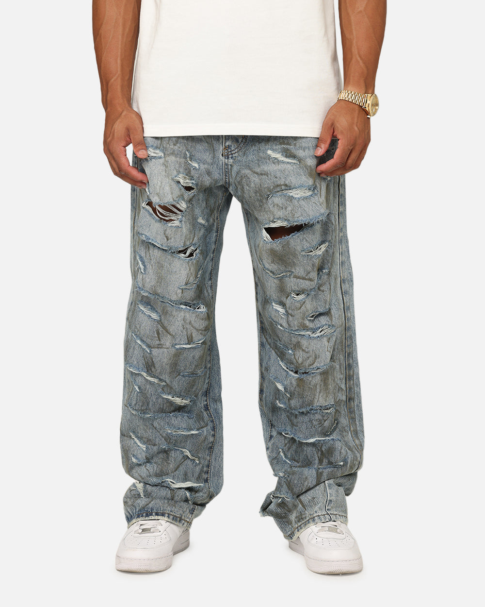 Elevate your fits' with the Ultra Baggy Thrashed Denim by MNML. These are designed with an oversized ultra baggy fit, constructed from denim with a vintage wash, extensive distressing throughout, featuring standard five pocket denim details, and finished with a button placket. Cop yours today at Culture Kings.