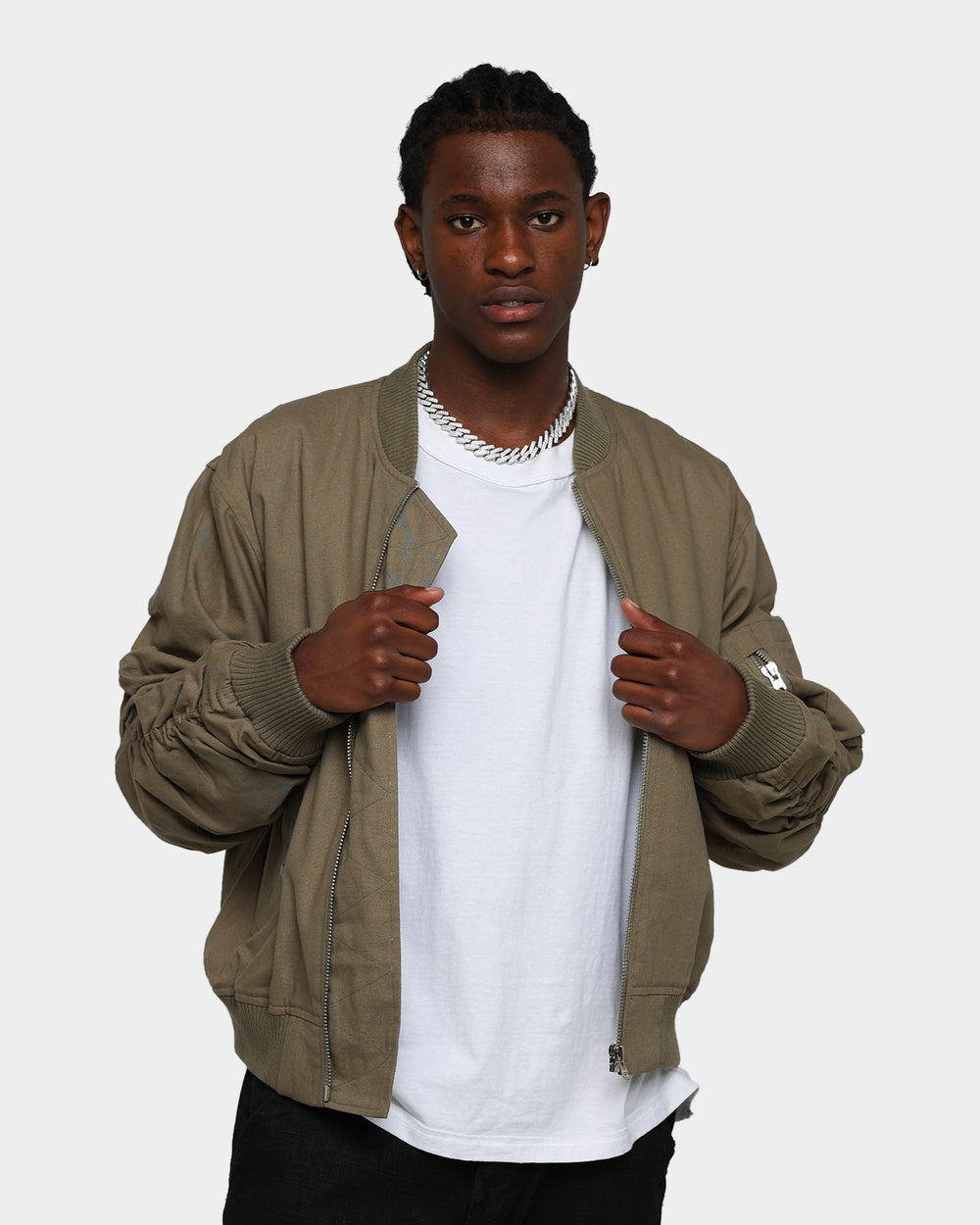 Due to styling Jabari is wearing a size L for a standard fit.