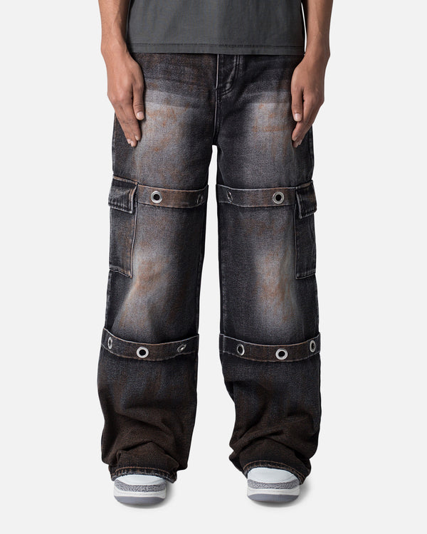 The Baggy Ring Denim is a bold addition to our collection. Featuring our latest Void fit with extra room in the waist, hip, and leg opening, along with an extended inseam from our Rave Fit. Constructed from a vintage washed black poly-cotton denim with rust stains throughout, embracing traditional 5 pocket denim details, metal eyelet details on the legs, oversized cargo pockets at the outseam, and finished with a poly coating throughout for a sheen on the fabric.