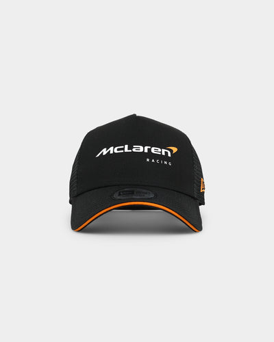 A classic New Era Trucker Cap with mesh sides and rear in McLaren colours with McLaren Racing logo on the crown.