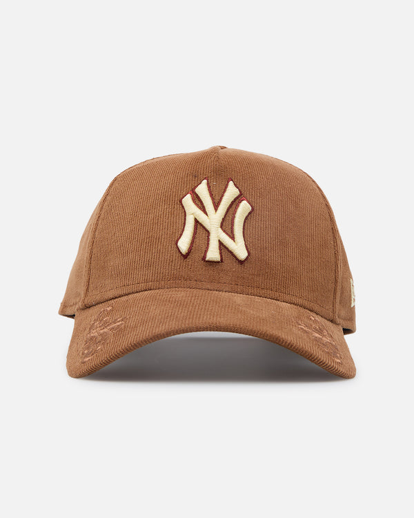 The New York Yankees Ornamental Cord 9FORTY A-Frame Snapback features an embroidered Yankees logo at the front panels with ornamental stitched details at the visor, a brown undervisor, and a snapback closure at the rear. The New Era 9FORTY® A-Frame™ is an adjustable snapback style that merges the front two crown panels into one, creating a high-profile pinched shape.