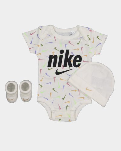 The only thing cuter than this matching set is your little one wearing it. With the Swoosh logo repeated on the onesie, plus snap buttons for easy changing, you'll want to pair the soft beanie and cuffs for the ultimate outfit.