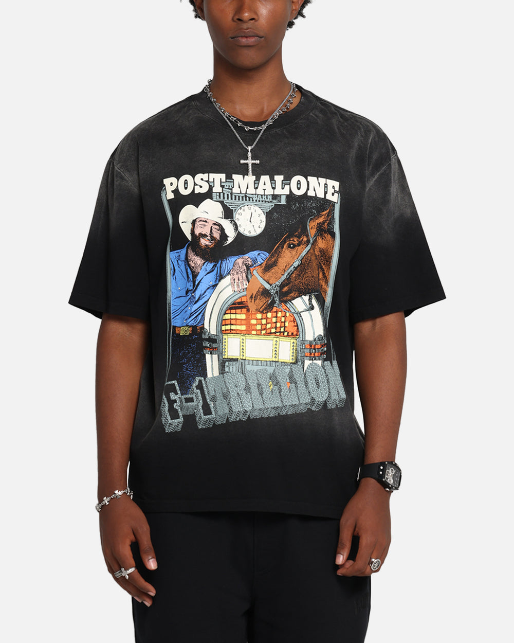 The Post Malone F-1 Trillion Horse T-Shirt is a must-have in your collection. With a printed graphics, with dropped shoulders and twin-needle stitching for a laid-back look and feel. Made with premium construction, it's the tee to rep in. Cop yours today.