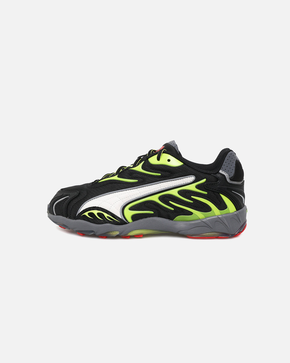 A$AP Rocky puts his own spin on the PUMA Inhale. The progressive streetwear staple is re-engineered with a mesh upper, heat cut flames surrounding the Formstrip, and a translucent gradient sole. Silver detailing, a FLACKO logo on the tongue, and a printed custom footbed round off this track-to-street icon. Cop yours today at Culture Kings.