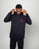 A slightly oversized hood in a heavy weight french terry cotton. Softened, pre-shrunk and piece dyed for the ultimate sweater. Signature PYRA logo print on the chest, with a back graphic print. Front kangaroo pocket with hidden key clip, double layered hood with ribbed hem and sleeve cuffs. Folded pip on Hood, woven badge on front corner. Signature mountain embroidery logo on the sleeve.