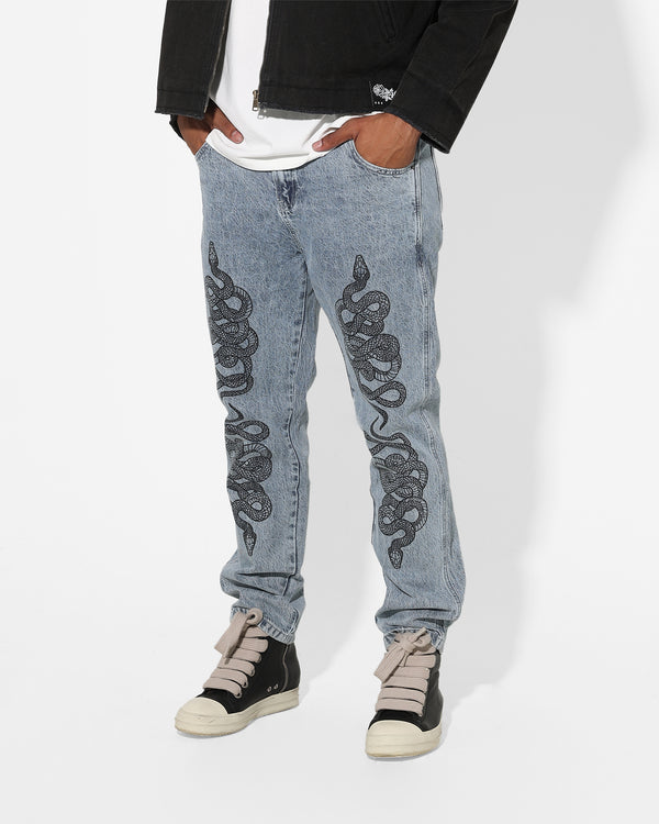 You can't go wrong with a solid pair of jeans like the Death Adder Relaxed Jeans from Saint Morta. Featuring relaxed denim, snake print, and Saint Morta embroidery. Cop yours today!
