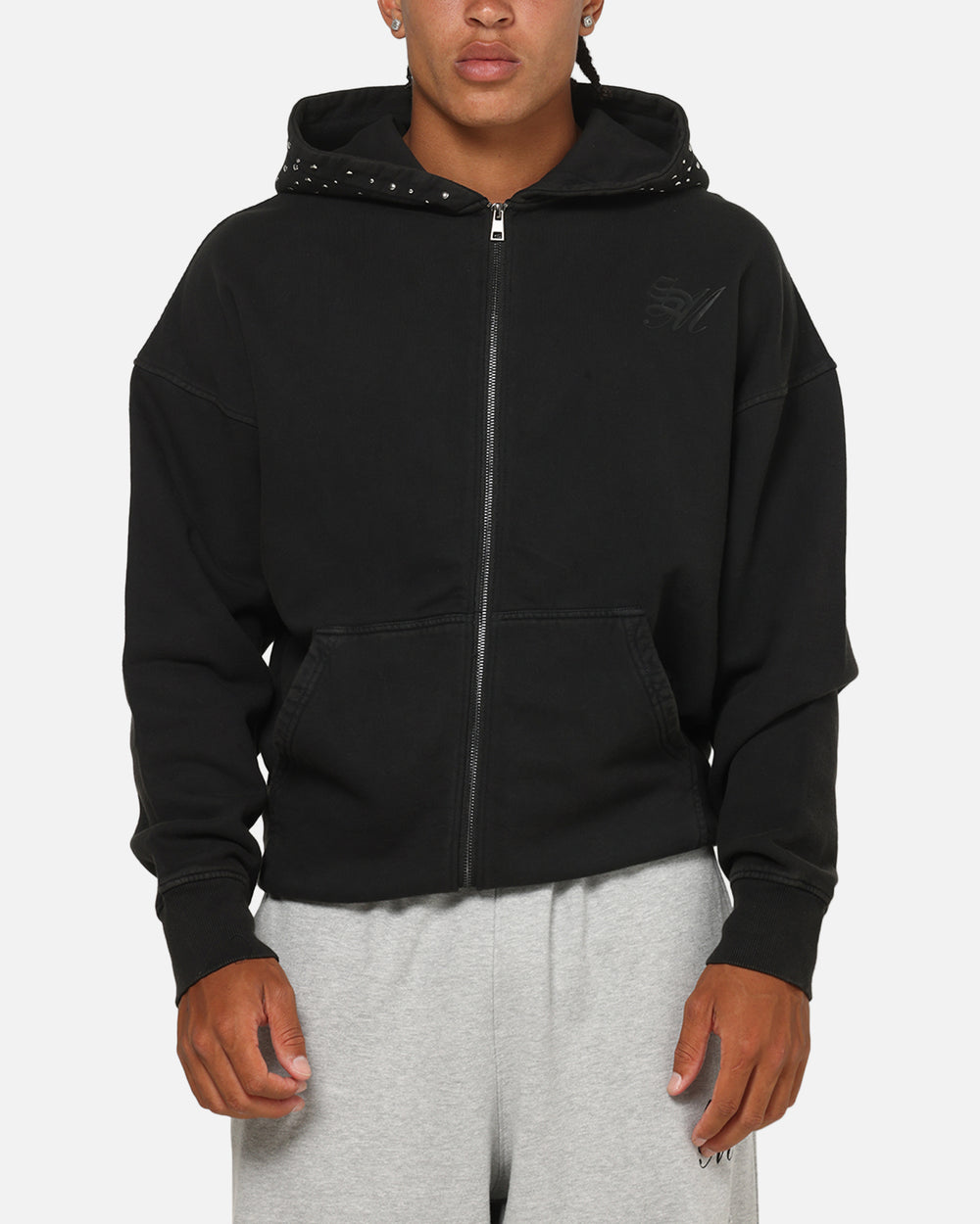 Designed to be bold, this hoodie is sure to standout in your closet. Featuring metal stud details on the hood with a printed logo for an elevated look, full zip close that lets you customise your look and ribbed trims to keep you warmer for longer. Be sure to secure yours today.