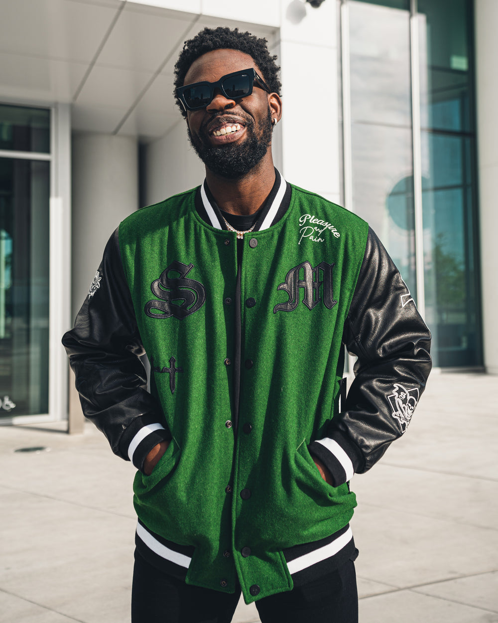 You'll want to take a closer look at the Graveyard Varsity Jacket. A variety of mixed media Saint Morta graphics feature on a melton wool body and PU leather sleeves that make this jacket a premium piece to own.