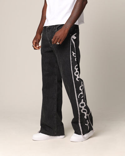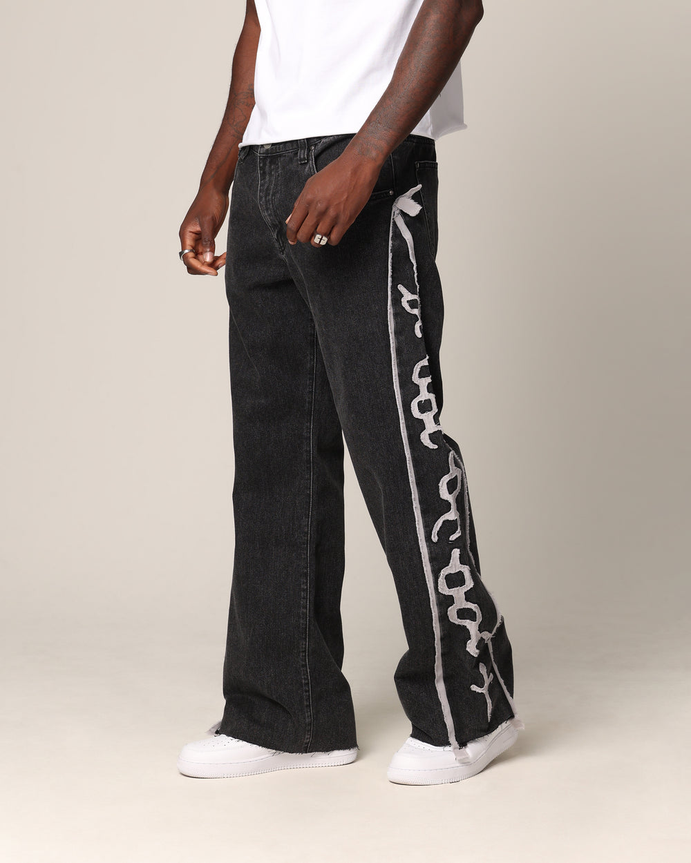 Spice up your fit with these iconic jeans. The Holy Ghost Flared Jeans feature a fire design cut out from contrast denim that trails down each leg. Not only that, but they end in a raw hem for an edgier look. Cop yours today.