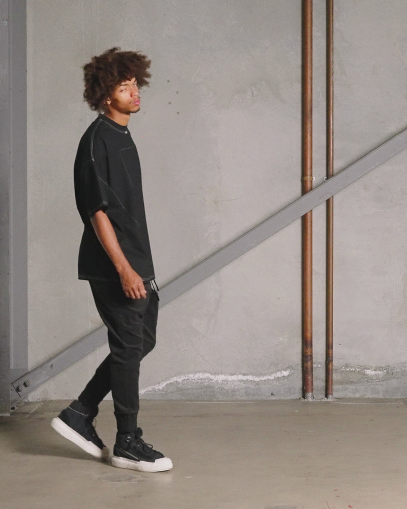 Model Omari normally wears size M top and size 32 / M bottoms
