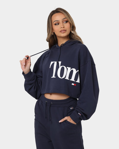 Comfort meets streetwear staple with the Tommy Jeans Women's Super Crop Bold Hoodie. Featuring bold, printed brand graphics and dropped shoulders for a standout vibe with an iconic edge. Brushed fleece interior and ribbed trims lock in the warmth to keep you cozy in this hood. Cop yours today!